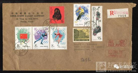 1980年北京航空挂号寄柏林印刷品一件、贴T46猴年、J54冬奥会各一套、T44(16-14)、普16(3分)各一枚、销2月15日北京戳