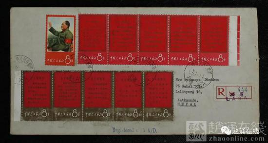 拉萨航空挂号寄尼泊尔封一件、贴文1毛泽东思想一套(部分带边、色标)、销拉萨戳、有落戳