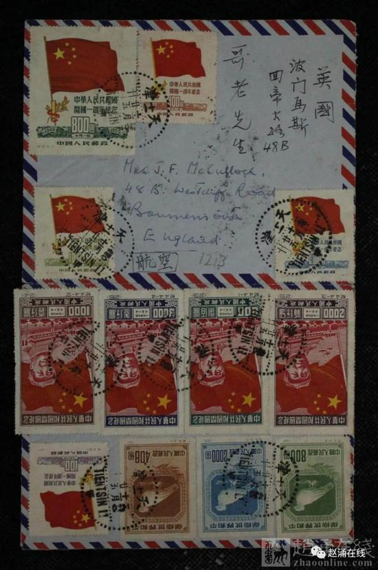 1950年天津航空寄英国封一件、贴纪4、纪5、纪6原版各一套、销11月25日天津戳