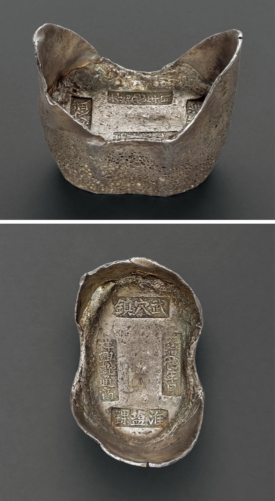 两淮盐场是中国四大海盐产区之一,所产淮盐粒大色白,品质优良,畅销内陆多省,湖北即长期行销淮盐。武穴历史悠久,自古就是长江中游重要深水港湾,商帮云集,清末发展成为湖北省七大商埠之一,曾总领鄂东数县的盐务,淮盐销量与汉口相当,每年征收的淮盐盐课,无疑是当地税收之大宗。迄今所见,打“武穴镇 淮盐锞”铭文的大宝存世仅三枚,皆为光绪年所铸,国内外相关文献目录均未见记载,公开拍卖尚属首次,属湖北盐税锭珍罕品种。