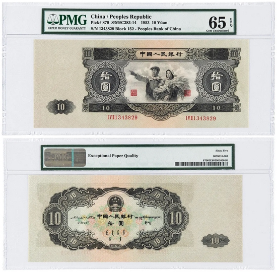 由于第一套人民币为旧币值,难以适应飞速发展的商品流通和经济建设需要,1955年3月1日起,中国人民银行开始发行使用第二套新币值人民币,共计十一种面值、十三个品种、十五种版别,与第一套人民币的兑换比率为1∶1万。1964年4月14日,中国人民银行发布通知,限期回收委托苏联印制的1953年版叁圆、伍圆及拾圆三种面值的票券。其中,拾圆券俗称“大拾圆”“大黑拾”,因面额最大,退出流通时回收彻底,流传至今已不多见,是二版币最为珍贵的品种。此枚票面无瑕,原色饱满,品相高达九八成新,获PMG评级冠军分,极为难得。