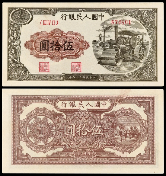 建国初期,纸币印刷技术水平有限,尤其缺乏优质印钞纸张。因此,第一版人民币在流通过程中非常容易磨损、脱色,留存至今品相多有瑕疵,保存完美者一券难求。此枚伍拾圆“压路机”,虽已退出流通长达半世纪之久,却仍能保持色彩饱满,图纹清晰,实属难能可贵。