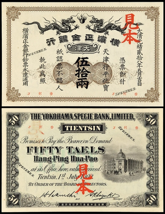 横滨正金银行创立于光绪六年(1880年),总行设在日本横滨,十九年(1893年)起,先后于上海、牛庄、北京、天津等地开设分行。二十八年(1902年),天津支行首发银两票39204两,面值有伍两、拾两、伍拾两、壹百两四种,这是该行在华发行的第一种纸币,随后上海、牛庄、北京支行才分别发行本地银两票。三十二年(1906年)底,横滨正金银行依日本政府指令,停止在华发行银两票,改发银元券。之后,流通中的银两票回收殆尽,传世仅见样票。此枚天津伍拾两便是该行最早发行银两票之样票,品貌俱佳,具有珍贵的外资银行货币史料价值。