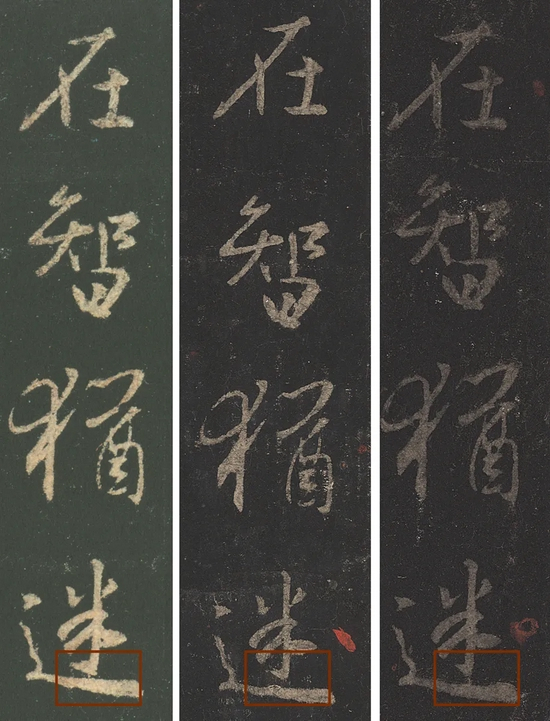 以下考据字对比图,右:西泠秋拍本,中:南宋拓本,左:东京博物馆藏朱卧庵本(南宋拓)
