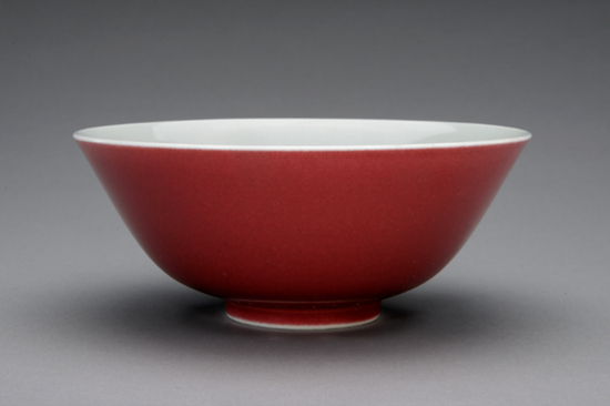 器内及底部施白釉,其外通体施祭红釉,釉色均匀浓艳,与规整优美的造型相结合,更显天衣无缝。祭红又名‘霁红’,明洪武时已烧制成熟,是以铜为着色剂,在高温还原焰中烧成。