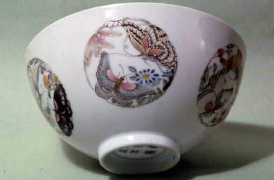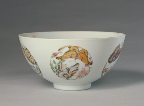 碗敞口,深腹,圈足,内壁白釉,碗心绘以团蝶纹。外壁绘珐琅彩团蝶纹四组,每组团蝶纹由两只相异的蝴蝶与四季花卉纹构成,花卉蝴蝶细腻妩媚,艳丽非凡。足底施白釉,蓝料彩双圈内楷书‘雍正年制’四字款。