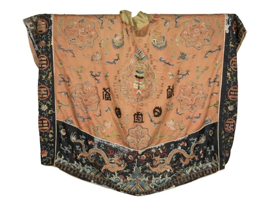 两袖以八卦纹、花卉纹、蝠纹交织组合装饰,为典型吉祥纹样。道士服装按照地位以及刺绣图案的多寡,主要分为绛衣、道服以及海青三种。其中绛衣位阶最高,刺绣图案最丰富,一般穿着在地位较高的道士身上,应用于重要仪式场合。绛衣图案常见有宝塔、灵兽、八卦等,配置并无一定规则,主要是表现出道教天庭,以及驱邪除魔的隐喻。从刺绣图案及精美程度可以判定,此件道袍应为绛衣。