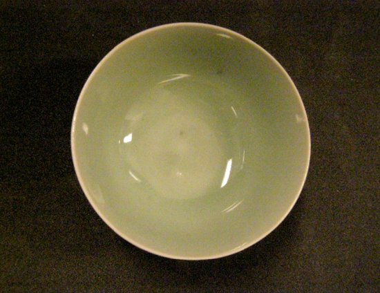 此碗内外均施粉青釉。内壁使用暗刻技法,口沿处饰以回纹,碗心饰以缠枝牡丹纹。外壁则使用浅浮雕技法,口沿处饰以祥云,碗身一圈绘以缠枝花卉纹,寓意吉庆富贵,生生不息。底部有‘大清乾隆年制’六字篆书刻款,稍有磨损。