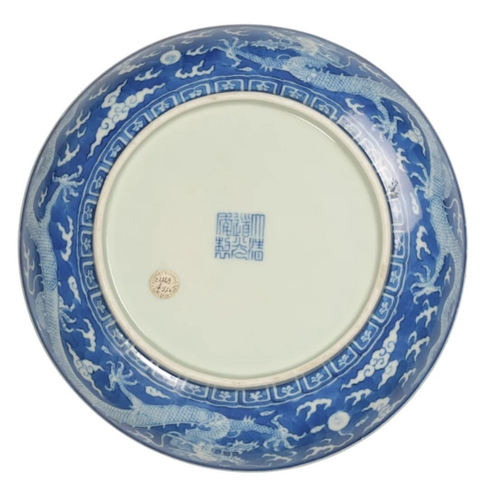 此件作品内外皆以青花为地,以留白之法绘云龙戏珠纹。盘心正中所绘苍龙双目圆睁,须发横飞,五爪如轮,肢体矫健,遒劲有力,周身犹如腾云驾雾,威仪不凡。盘壁内外侧各绘有一组双龙戏珠纹。整盘共绘有五条苍龙,生动威猛,呼之欲出。圈足规整,典型的泥鳅背,盘底写有‘大清道光年制’青花篆书款,官窑气息浓烈。