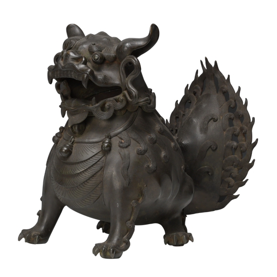 此拍品为铜铸瑞兽,色古而凝重。头呈龙形,双目圆睁,耳尖上翘,身型健硕,筋骨强健,肌肉饱满,四肢关节处有火焰形装饰,四爪如钩踞地有力,尾部为火焰形。兽体中空,头部为盖,内可焚香。试想当年每当香料点燃,香烟缭绕之中,必是为殿宇增添了一层祥瑞和浮华的色彩。