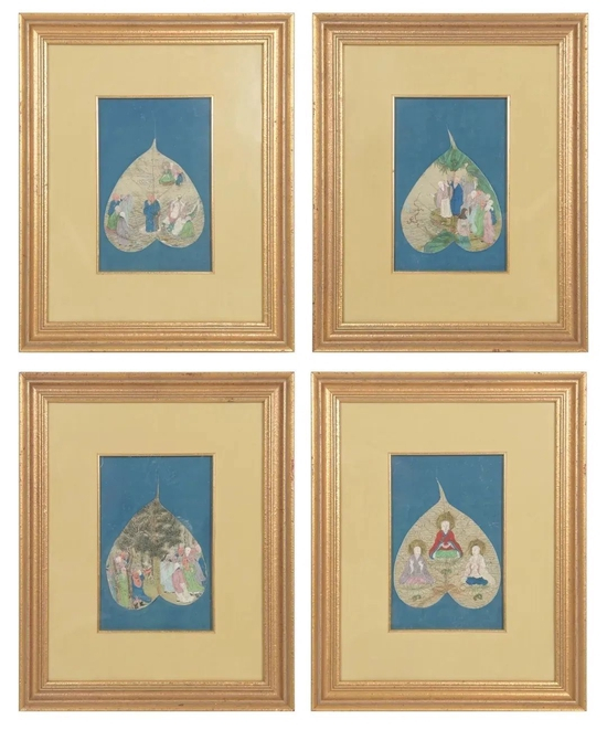 本件作品正面为彩绘贝叶画,内容以佛经典故和罗汉为主,所绘人物眉目神态毕现。背面为蓝底金字手抄《心经》和《金刚经》。乾隆皇帝笃信佛教,令人制作菩提叶笺,在叶笺上御笔亲书《般若波罗蜜多心经》。他还命内廷画师在菩提叶上精心绘制观音大士、罗汉等墨像,装裱成册,钤以御印,配上函套。本件作品从罗汉与书写经文相结合的形式来看,应是十八世纪乾隆宫廷佳作。