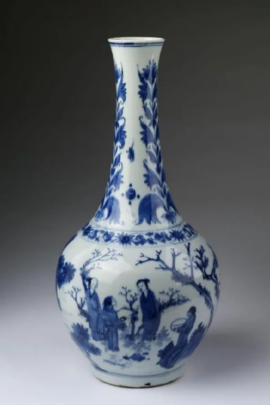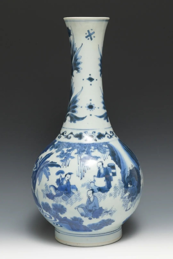 此瓶撇口,长颈,圆鼓腹,高圈足。颈部饰郁金香纹,腹部绘竹林七贤,构图错落有致,层次分明,颈腹之间以一圈缠枝花纹间隔。釉面白中泛青,青花色料采用土青,呈色稳定,青花发色青翠艳丽。