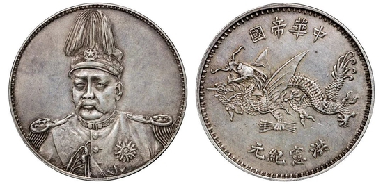 “冲天冠”版样币由天津造币总厂雕模试铸,因袁世凯大元帅服鹭羽冠异常高耸,近乎与币缘相接、大有冲天之势故得此名,传为造币总厂学徒摹刻,前后共试铸了共和纪念壹圆、中华帝国洪宪纪元二款,前者较后者更为稀少。今春以上两种版式的“冲天冠”样币同场参拍,“共和”包浆绚烂,品相顶级,冠居PCGS评级榜单首位;“飞龙”原始包浆,名家手泽,可谓佳品成对,好事成双。