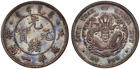 光绪二十八年(1902),直隶总督袁世凯奏准设立北洋铸造银元总局,并于当年12月15日正式开工。随后,银元总局遵照袁世凯指令,开始筹备一两银币的生产,模具由大阪造币局承制。银元总局依照日方建议制作了坯饼,经袁世凯批准后试制约六七千枚,但并未发行。 “户部一两”是中国近代铸币史上尺寸最大的机制龙银,主币之外还有五钱、二钱、一钱及五分四种面额辅币。因彼时朝廷还在“圆”“两”之间举棋不定,未能修成正果。以存世实物来看,一两样币基本都被回炉改制,因而所见极罕,顶级品相者几乎绝迹,目前PCGS评级SP63+以上之完美品仅四枚。此枚不仅先天铸打拔萃超群,且包浆自然至美,紫罗兰色瑰丽彩光动人心弦,殊为难得。