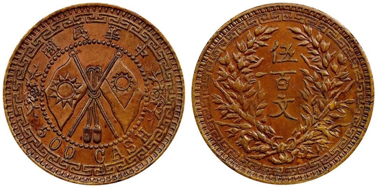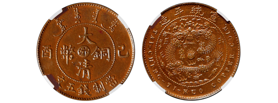 民国时期,河南历任主政者都竞相鼓铸大钱牟利,以致物价飞涨,民不聊生。据上海博物馆研究员周祥研究,现存河南铜元实物中,面值最大的是伍百文铜元,也是所见最少的一种。从其正面装饰的双旗图案,可以确定它的铸造时间不会早于1932年。1930年河南省发行当二百铜元之后,跳过当三百、当四百和当五百,直接铸造过面值八百文的铜元流通,结果“成全省金融极恐慌严重事件”,商民呈请收回,尽数收毁。接下来省府命令换铸相对面值较小的伍百文铜元,创中国机制铜币最大尺寸和面值纪录,但面世后“事实尚未奏效,商民有呈请继续收回”。从铸造时间上分析,河南伍百文铜元实际铸造和流通的时空相当窘迫,铸额原本无多,加上不受市场欢迎被收回,时至今日,已成为泉界公认的铜元珍品。此枚图文压印深峻,底版平整洁净,带有温润铜光,是为迄今所见河南伍百文样币之最佳品相,获PCGS冠军评分,实至名归。