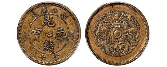 光绪二十八年(1902),湖广总督张之洞奏设铜币局,向英国伯明翰退辣车伦制造厂订购机器设备及模具,于武昌厂开铸铜币,该厂产能为当时各省局之冠。据考证,铸币机器制造厂商都没有雕刻师,模具全赖外包。退辣车伦制造厂于八月接到订单后,便将模具交给英国著名雕刻师艾伦·韦恩制作。其于同年四月受伯明翰喜敦造币厂委托,刚完成了浙江当十水龙的模具,因浙江与湖北二厂开制时间非常紧迫,艾伦·韦恩遂将浙江龙模配上新刻湖北币面送交预审。“湖北圆珠龙”即在此种情况下诞生,有红铜、黄铜和白铜三种材质,存世皆极为罕见。周沁园、李平文编著《中国机制铜元目录》中,将此品种币列为一级品,足见其珍贵程度非比寻常。