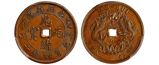 光绪二十八年(1902),安徽巡抚聂缉椝奏准在安庆原银元局旧址成立安徽铜元局,增添造币机器二十部,开始试制满文“宝皖”方孔十文水龙铜元,开工未及两日,机器忽生故障,虽然史料并未载明具体故障原因,但根据实物状况及间接史料印证,极有可能是因为生产方孔铜元时,缺乏给币饼穿孔的专门设备,凿孔操作费工费时而且脱模困难,新制铜元无法快速量产,铜元局终因无利可图,放弃了这款方孔式样铜元的铸造。安徽方孔因制作精美且存世极稀,人们普遍将其认定为试铸样币,是中国最具传奇色彩的铜元珍品。此枚破版样币经GBCA评鉴获最高分数,身价不凡。