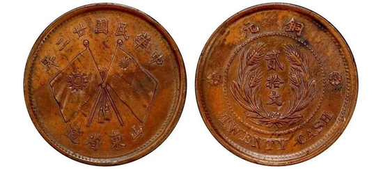 1930年9月,韩复榘就任山东省主席之后,即拟重新设立造币厂,铸造铜元裨补市面流通,但是山东铜元局最终流于纸上谈兵,并未开机生产,推测是遭到南京中央政府的反对。当时上海中央造币厂已竣工投产,早已制定壹圆主币及辅币规格,山东铜元局仍自制铜元实属僭越中央造币权,未能铸行情理之中。此枚山东贰拾文即为未核准发行之试制样币,系民国铜元重要品种,亦属所见品相最佳之尤物。