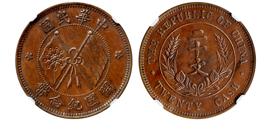 民国肇建,各省局所铸钱币大都以“开国纪念”为币文彰显新世界的到来。鄂省亦不例外,1915年武昌造币厂刻好开国纪念币五文币模,但彼时铜价已高,若付诸生产将会造成巨大亏损,因此财政部未同意量产。翌年,湖南省十文、二十文铜元开始在湖北流通,武昌厂在铜价高涨之下,只有制造高面值铜元才能有利可图,于是雕妥开国纪念币二十文币模并准备生产,但此案也被财政部驳回。因此,开国纪念币五文与二十文都只有极少数样币存世,二十文者迄今所见不超过五枚,属民国铜元顶级珍品。此枚为NGC唯一入盒纪录,弥足珍贵。