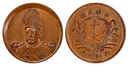 1912年中华民国临时政府在南京成立,黎元洪当选副总统兼领鄂督,翌年,他投靠北洋阵营,支持袁世凯镇压二次革命。10月初,袁、黎二人被国会选举为中华民国首任正、副大总统。随后,黎元洪应袁世凯之邀离开武昌,入京履职。据何代水、周沁园编著《百年铜元》一书推论,黎元洪赴京前,为逢迎大总统袁世凯,特令湖北武昌造币厂雕模制作了少量袁世凯像共和纪念十文铜币,有“大面像”与“小面像”两种版式。大面像或因胸前勋章尺寸过大、比例失调而未被采用,存世仅见试样,位列中国铜元十大名珍。此枚“大面像”曾被美国钱币收藏家拜伦·怀特秘藏达半个世纪之久,怀特过世后,其家人将整批中国铜元悉数转让给好友戴维·鲍尔斯家族珍藏了数个春秋,直到2018年香港“鲍尔斯家族集藏中国铜币”专场拍卖会公开面世。样币图文铸打极为卓越,细节完美,堪称近代人像铜币巅峰之作,冠居PCGS评级榜单首位,至为珍贵。