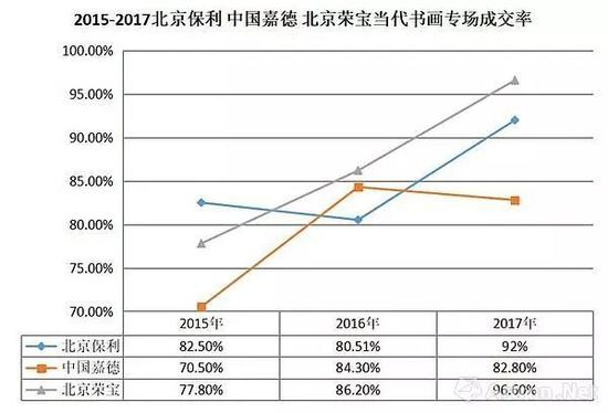 中国嘉德近三年的上拍量相对稳定,平均成交率达到8成。北京荣宝上拍量在2017年达到最多,成交率更是高达96.6%,总成交额飞跃至2.43亿元。值得一提的是,王镛、何家英、范扬、王明明、江宏伟、李翔、史国良、唐勇力、田黎明、冯远组成的“荣宝十家”取得优异成绩,春秋拍两场116件拍品全部成交。秋拍中新增加的“以文会友·当代名家书画”专场也取得白手套。就2017年度看,北京这三家拍卖公司的当代书画专场总成交额都达到亿元。