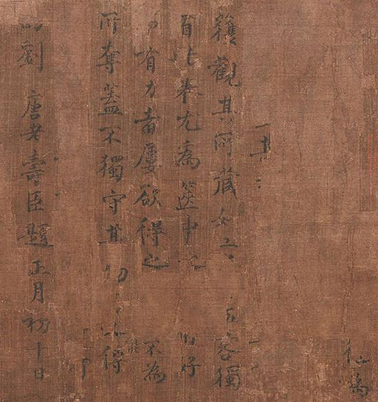 | 传王维《著色山水图》(局部)画面破损度相对较高,包括图中右侧“刘唐老”题诗在内的很多留存信息的真伪遭到了质疑 |