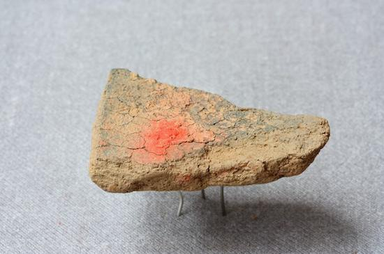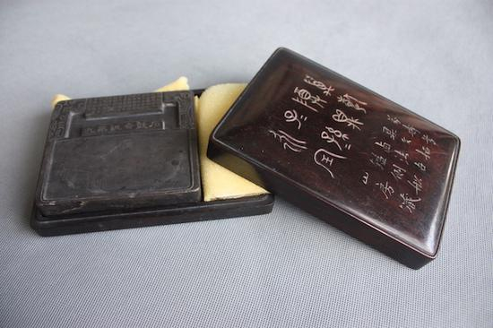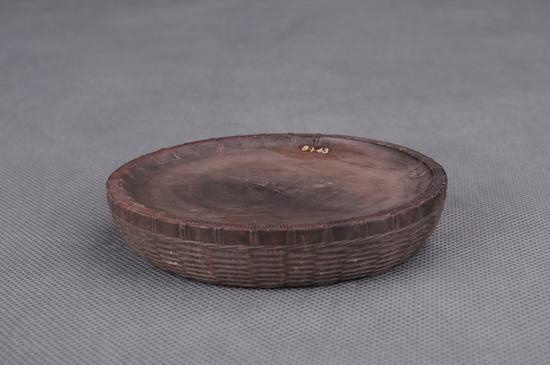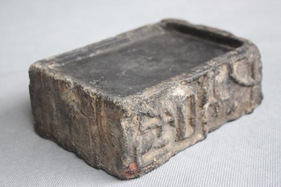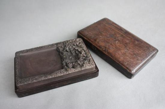 砚台是由原始社会的研磨器演变而来。初期的砚,形态原始,是用一块小研石在一面磨平的石器上压墨丸研磨成墨汁。至汉时,砚上出现了雕刻,有石盖,下带足。馆藏有西汉画眉点脂砚(图一),一套两块,一为方底圆面画眉石,一为陶片上有胭脂痕。为古代妇女化妆用具。