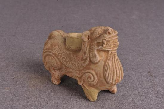 馆藏六朝青釉陶兽水盂(图十),塑为狮形,昂首站立,全身用细纹刻画出卷曲的毛发,狮背有一长颈口,狮身饰青釉,开鱼牙片纹,看起来形态生动、雄浑。