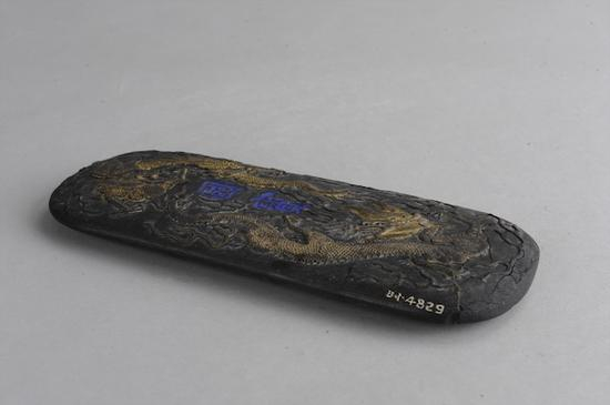 馆藏清双龙祥云纹墨(图七),长形,四角圆,边沿较薄。一面印双龙,围绕上下中部“国宝”二楷字填普蓝;另一面四组祥云,中部“大明永乐年造”六金字。龙云亦填金。清乾隆时仿制。