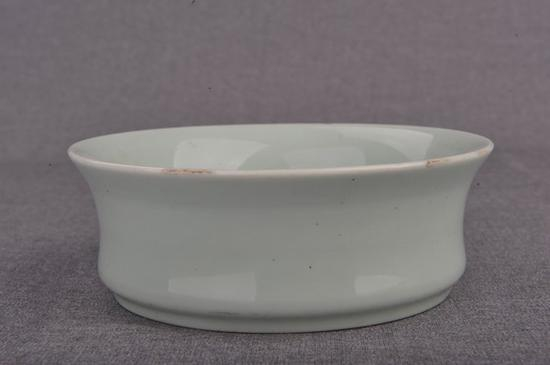 馆藏清雍正粉绿笔洗(图十五),敞口束腰,圈足。通体呈粉绿色釉,白胎。釉色均匀,器型规整。器底青花篆书款“大清雍正年制”六字双排款。制作精美工整。