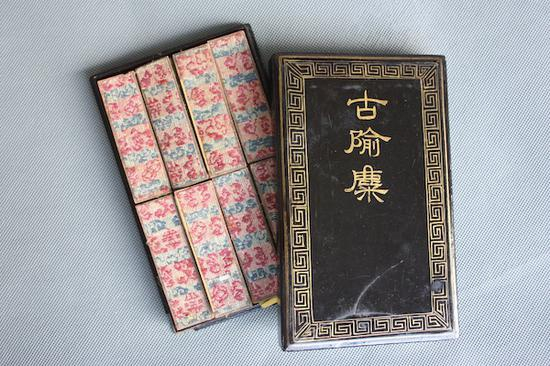 馆藏清古渝麋墨(图六),漆盒盛有墨八锭,大小式样全相同,长方条形,顶部为椭圆,无纹饰,一面“古隃麋”三金字,另一面“徽州詹素亭珍藏”七金字,两侧分别有金字:“益元氏选炯”与“詹素亭监制”,顶部有“五石超顶”四字。