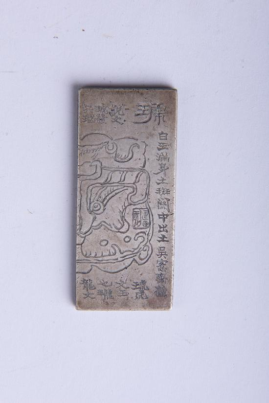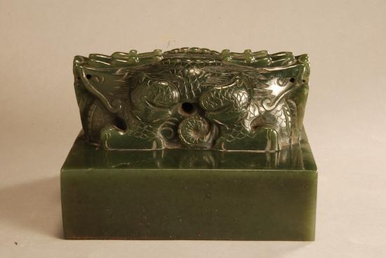馆藏清“凤麟洲宝”玉印(图十八),碧绿色,通体葱郁泽润,形体颇大而方整。纽作高浮雕“天禄”连体双兽形,两首背向,四足,作蹲伏状。印面阔边朱文,小篆“凤麟洲宝”,双行竖读。凤麟洲是我国古代传说中神仙居地,在西海中央,洲上有凤凰与麒麟,数百合群,仙家用凤啄和麟角煎制成胶,名“集弦胶”或曰“连金泥”,称能粘连断弦折剑。这方印当属闲章,而传世经历不详,1953年安顺专署文教科拨交我馆收藏,据称此印原藏中央古物保存所。抗日战争时期,该所藏品随故宫藏品运至安顺躲避战火,此印在这一时期散落在安顺。中央古物保存所的藏品大多为明代应天府的故物,据此推断,这方印当是明代王公玩物。