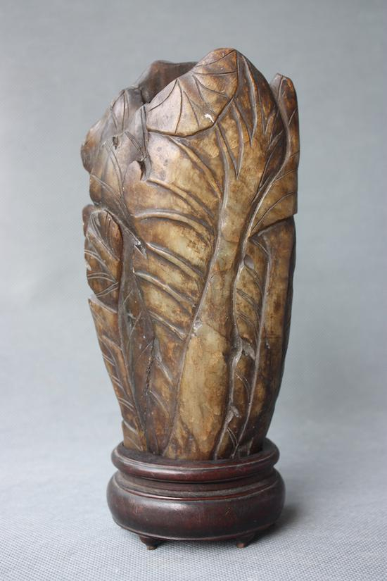 馆藏清白菜形青田石笔筒(图十四),石质微黄带青,青田石雕成白菜形状,惟妙惟肖。配椭圆台型六足木座,即可使用,又具有赏玩价值。