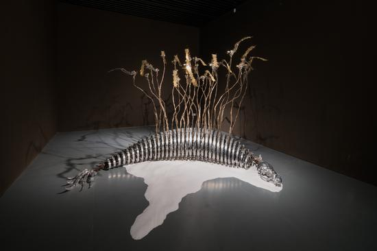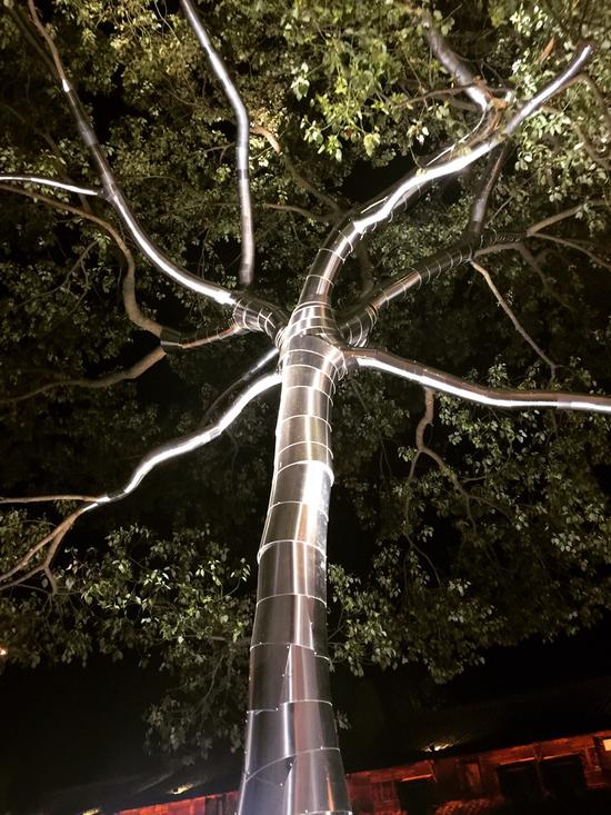 这件作品是在乌镇水乡的西栅景区,艺术家将水边的一棵树的枝干用金属给包裹了起来。我路过这件作品的时候,正好听到一个东北大哥问旁边的安保人员:“这棵树为啥包起来啊?”