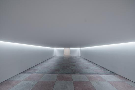 尺寸巨大,占据整整一个空间。感觉像是上面吊了一个顶,巨大的水泥石板把空间分为上下两部分。观展的人们走进这个空间,只能看到一个空空的矮房间,个子高的人还得低着头走。同行的人问我,这件作品是说,我们都是下层人吗?