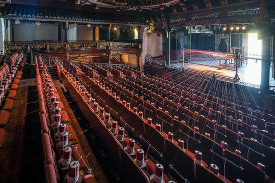 这件装置是此届艺术展我最喜欢的作品之一,来自美国艺术家安•汉密尔顿的《唧唧复唧唧》。用汉密尔顿自己的话来讲,“我们做这样一个大展,我觉得我来了,不仅要带来我的东西,而且也要跟当地发生关联”。乌镇是缫丝旧地,艺术家选择了一个传统的剧院作为主场,舞台上是一架旧旧的织布机,根根红线被座位上的线轴缠联着。女工一扬手扯线,整个剧场随之引动。