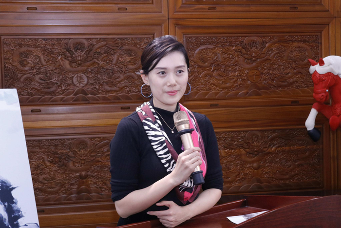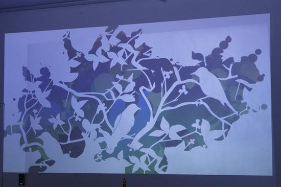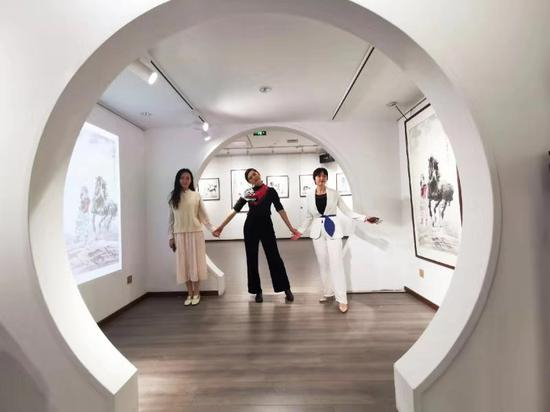 执行策展人王文岩在发言中着重为大家介绍了本次展览中运用到的新媒体技术。圆弧形的空间墙面上,面对面的放置着两幅《云淡风轻》作品:一幅实体画,一幅则是根据该画制作的多媒体动态投影,彼此行成镜子一样的对照,互相映衬,让人去反思实体和虚拟之间的连接和断裂。另外,AR技术、投影交互等现代科技手段也在新媒体设计师毕雅琳的精心设计中,有机融入到画作的呈现之中,增加了趣味性的体验感,深受年轻受众青睐,在互动的过程中,传统艺术得以与现代生活巧妙连接。