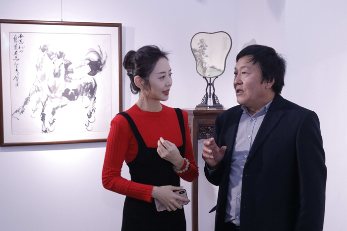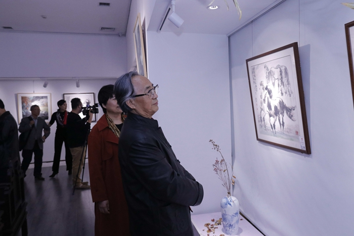 最高人民法院书画协会副会长、中央国家机关书法家协会副主席兼秘书长、中央国家机关美术家协会副主席尹祥君先生在发言中提到,画家周殿平的画重点在于马的造型和笔墨上,中西合璧,线面结合,以大块墨和线条突出马的肌肉与骨骼,并代表中央和国家机关书画法家协会和美术家协会对周殿平表示衷心的祝愿。
