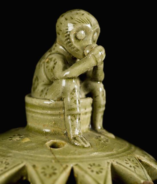 三国吴越窑青瓷灵猴捧桃连座熏炉(局部)