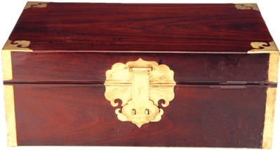 这件状元箱(如图)以紫檀木为材料,呈规则长方形,长24厘米,宽13.5厘米,高7.5厘米。箱体四面垂直成90度角,每角之上包铜片,箱盖四角饰如意纹铜包角,箱正面装饰有铜质朵云形面叶及如意云朵拍子,可挂锁。两侧有铜质提手,方便搬运与携带。此“状元箱”造型质朴沉稳,简洁端庄,通体光素,毫无装饰花纹,尽显木质本身的独特纹理,纹路清晰,深浅不一,打磨精致,纯净自然,线条流畅优美,给人以文静、柔和的感觉。