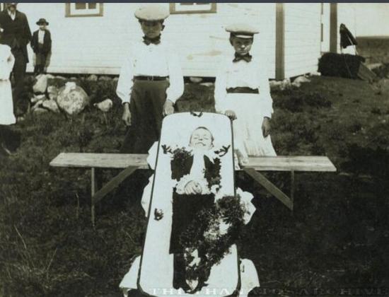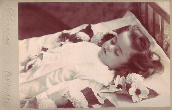 尤其是对于那些早年丧子的年轻夫妇来说,他们的孩子来世间惊鸿一撇便匆匆归天,一张死后的相片很可能就是留存后世的唯一纪念了。于是悲伤的父母 把自己的爱子精心打扮,拍下他们在缀满鲜花的摇篮里安睡的最后容颜。考虑到那个时代居高不下的新生儿死亡率,这种行为渐渐流行开来,也就不足为怪了。随着 后来摄影技术的进步,人们还冲印出更多相片的副本,寄给多位亲朋好友。
