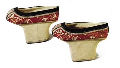 旗 鞋木底是其特色,它的高跟木底极为坚固,常常是鞋面破了,而鞋底仍完好无损,还可再用。满族妇女讲究穿木底鞋,这也是满族先民有“削木为履”习俗的反映。 至清初已发展成为高跟木底的女鞋,尤其满族贵族妇女,穿的更为普遍。满族妇女不尚裹脚,通常穿着宽大的旗鞋。高底鞋是最富民族特色的鞋子,鞋底中部足心的 地方垫一个高约10厘米的高底,外裱纳好的数层白布。这种鞋跟,分马蹄形、花盆形和元宝形三种,鞋口镶边,鞋面刺绣、堆绣各种花纹。清代宫廷妃嫔所穿的高 底鞋和花盆底鞋,一般高3至5寸,慈禧太后的花盆底鞋高约4寸。还有一种说法是满族妇女穿高底鞋,除了美观因素,也跟满族发源于东北寒冷之地有关,用木头 制成的厚厚鞋底可阻隔寒气,更好的保暖。