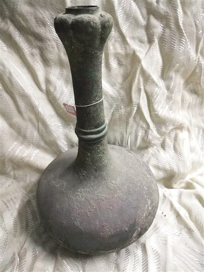 蒜头瓶乃收藏品中的高档器型,完整的十分难得。初现是在商周时期,往后蒜头瓶逐渐变为陈设器,青铜蒜头瓶也逐渐被陶瓷蒜头瓶所替代。所以市场上青铜蒜头瓶十分难见。收藏爱好者王先生家藏一个青铜蒜头瓶,王先生视为珍宝,平日里保存得极其小心。“虽然这小小瓶子看起来不起眼,但却代表了我国酒器的巅峰时代,也是我们国家酒文化的代表。”收藏爱好者王先生对蒜头瓶爱不释手。