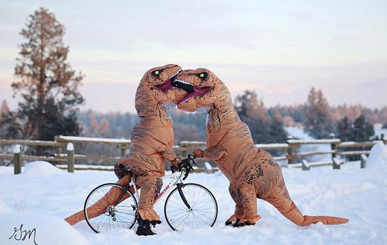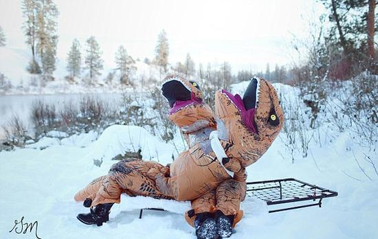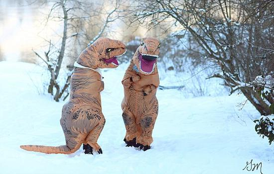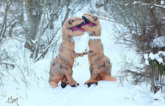 在一张照片中,两只“霸王龙”牵着手,漫步在白雪皑皑的湖岸,无比温馨;另一张照片中,他们依偎在一起,十分甜蜜;还有一张照片中,他们手舞足蹈,享受着在森林中举办的舞会,欢快又浪漫。为了将两只“恐龙”区分开,其中一只围着一条雪白的围巾。