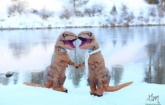 据英国《每日邮报》报道,近日,两位美国摄影师在华盛顿州斯波坎谷的一座公园拍摄了一组逗趣、温馨又感人的照片:一对假扮的夫妇穿着外形为霸王龙的服装,摆出各种亲昵的造型,场面十分有趣。