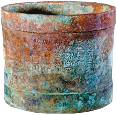 铜斛,秦代,青铜,高25.5厘米、径30.5厘米,壁厚0.8厘米,实测重量17.5千克,可盛大米23千克。上口下底分有一圈4.5和5.5厘米高的凸箍加固,器腹阴刻始皇帝40字诏令(见拓片释文),右起竖排,行8字5,单字1.5×2厘米,书体严谨浑厚,字形婉转飘逸,线条骨力丰沛,篆刻刀口深峻、大气磅礴,笔味、刀味、金石味扑面而来,堪称古铜刻之巅峰之作。背面居中伸出高2.5厘米、边长3.5厘米检封槽。此器为合范浇铸成型,包括检封槽与斛身对接处在内,通体未见一条范线、一只范瘤,足见设计、做工之精良。