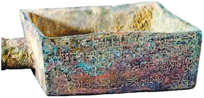 方升,秦代,青铜,全长24厘米、柄长11.3厘米,中空柄并饰圈箍;正方形升斗,边长12.7厘米、深5.3厘米、壁厚0.4厘米,重2.06千克,可盛大米1000克。右壁篆刻始皇帝40字诏令(见铜斛拓片释文),自底至口竖排四行,单字高1、宽0.8厘米,线条藏头护尾,书体纵豪横健,虽字字可见李斯书法严谨之风,却也不失工师刀笔之灵动雄奇风采与山岳庙堂气象。铸造年代应为先秦或始皇帝临朝时期,刻铭年份应在公元前221年至公元前209年之间。与之同诏书、同容积的秦方升仅有一件,现藏于上海博物馆,升斗则呈长方形。作为唯一面世的正方形始皇诏方升,同时作为大秦国家标准器,此量具有极高的史料补阙价值。