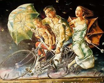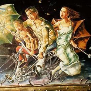 在细节真实的基础上,熊庆华绘画作品最大的特点就是,人、车、牛等所有东西都是漂浮起来的,仿佛要飞起来。对此,熊庆华说,他就是要反地球吸引力,让人脱离了地面,才能看起来更自在,更随意,更自由。