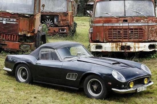 仓库里是已过世的法国运输大王Roger Baillon的收藏品,他从半个世纪前就开始收藏汽车,后来财力不支,卖掉了约50台,剩下的还有100台左右直接封存在仓库中,任由其氧化衰败。最终,这台250 GT SWB California Spider由法国巴黎艾德(Artcurial)拍卖行以原始状态售出,并未经过人工修复。
