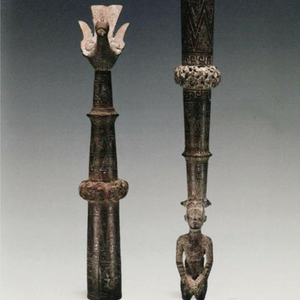 “断发文身”是古越民族的典型形象。这一形象在史书中常常出现,最有趣的是《庄子·逍遥游》中的一个小故事,说宋国商人带着华丽的衣帽来到越地贩卖,然而看到越人的形象,商人才发现这些豪华服饰毫无用武之地。我们前几年看过的电视剧《芈月传》中也曾出现过越人断发文身的形象。这件鸠杖上断发文身的越人,或许正是当时宋国商人看到的形象吧。